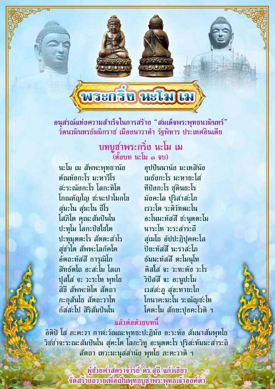 ประเด็นสำคัญของไฟล์นี้เกี่ยวข้องกับ การจัดสร้างวัตถุมงคลที่ระลึก ๕๕ ปี หลวงปู่กวย ชุตินฺธโร ณ วัดชิโนรสาราม วรวิหาร กรุงเทพฯ สรุปได้ดังนี้: 1. วัตถุมงคลและวาระการสร้าง วัตถุมงคลที่ระลึก ๕๕ ปี (พ.ศ. ๒๕๑๒-๒๕๖๖) หลวงปู่กวย ชุตินฺธโร อธิษฐานจิตวัตถุมงคล ณ วัดชิโนรสาราม การอธิษฐานจิตครั้งดั้งเดิม: หลวงปู่กวย ชุตินธโร อธิษฐานจิตวัตถุมงคลภายในพระอุโบสถวัดชิโนรสาราม เมื่อปี พ.ศ. ๒๕๑๒ การจัดสร้างปัจจุบัน (อนุสรณ์ ๕๕ ปี): จัดสร้างโดย ผศ.ดร.สุธี แก้วเขียว ในนามคณะศิษย์หลวงปู่ทวด หลวงปู่โต หลวงปู่โต๊ะ หลวงปู่กวย พิธีอธิษฐานจิตแบบโบราณ: จัดขึ้นภายในพระอุโบสถ วัดชิโนรสาราม เมื่อวันเสาร์ ที่ ๕ สิงหาคม ๒๕๖๖ วัตถุมงคลที่จัดสร้าง: พระพิมพ์สมเด็จเกศทะลุซุ้ม "โอม สิทธิ" หลังหลวงปู่กวย พระพิมพ์ขุนแผน "โอม สิทธิ" หลังหลวงปู่กวย คำว่า "อะ อุ มะ สิทธิ" (โอม สิทธิ): อะ = อะระหัง (แทนพระพุทธเจ้า) อุ = อุตตมธรรม หรือ อุดมธรรม (แทนพระธรรม) มะ = มหาสังฆะ (แทนพระสงฆ์) 2. มวลสารหลักในการสร้าง ผงพระสมเด็จกรุพระมหาพุทธพิมพ์: หลากหลายพิมพ์ ที่สร้างเมื่อสมัยสมเด็จพระพุฒาจารย์ (โต พฺรหฺมรํสี) และบรรจุกรุวัดไชโย วรวิหาร จังหวัดอ่างทอง ปี พ.ศ. ๒๔๐๐ / ๒๔๐๘ / และ ๒๔๑๑ (ใช้ทั้งส่วนที่บดละเอียดและผงเม็ดหยาบสำหรับฝังในองค์พระ) ว่านชนิดต่าง ๆ: นำมาบดละเอียด โดยมีกล้วยเป็นหลัก และว่านเมตตามหานิยม ผงมวลสารจากวัดชิโนรส ปี ๒๕๑๒ และผงธูป ผงดิน จากสถานที่ศักดิ์สิทธิ์ต่าง ๆ ในกรุงเทพฯ ดินสี่ทิศ: จากกุฏิหลวงตามหาบัว วัดป่าบ้านตาด ชนวนมวลสารหลักสร้างพระพิมพ์ขุนแผน: มาจากชนวนสร้างพระกริ่ง “นะโม เม” อนุสรณ์สร้างสมเด็จพระพุทธนวมินทร์ วัดนวมินทรธัมมิกราช ประเทศอินเดีย รวมถึงชนวนโลหะเก่าสมัยสุโขทัย, เหรียญคณาจารย์, ทองคำ, เงินยวงโบราณ, เพชรหน้าทั่ง เป็นต้น 3. รายละเอียดและจำนวนการจัดสร้าง (บางส่วน) พระพิมพ์สมเด็จ "โอม สิทธิ" หลังหลวงปู่กวย: สร้างรวม ๘,๘๗๑ องค์ ตะกรุดทองคำ ฝังมวลสารสมเด็จเกษไชโย: จำนวน ๒๙ องค์ (บูชา ๑,๒๕๐ บาท) ตะกรุดเงิน ฝังมวลสารสมเด็จเกษไชโย: จำนวน ๓๐๐ องค์ (บูชา ๕๕๐ บาท) เนื้อผสมดินกากยายักษ์-ดำ: จำนวน ๒๖๐ องค์ (บูชา ๒๕๐ บาท) พระพิมพ์ขุนแผน "โอม สิทธิ" หลังหลวงปู่กวย: สร้างรวม ๙,๘๗๐ องค์ ตะกรุดทองคำ ฝังมวลสารสมเด็จเกษไชโย: จำนวน ๗๐ องค์ (บูชา ๑,๒๕๐ บาท) เนื้อมหาชนวน "โอม สิทธิ" หลังหลวงปู่กวย: จำนวน ๕๐๐ องค์ (บูชา ๑,๕๕๐ บาท) 4. วัตถุประสงค์ในการบูชาและกิจกรรมอื่น ๆ วัตถุประสงค์ในการบูชา: เพื่อสมทบทุนปรับภูมิทัศน์ วัดนวมินทรธัมมิกราช เมืองนาวาด้า รัฐพิหาร สาธารณรัฐอินเดีย พิธีที่อื่น: ผศ.ดร.สุ